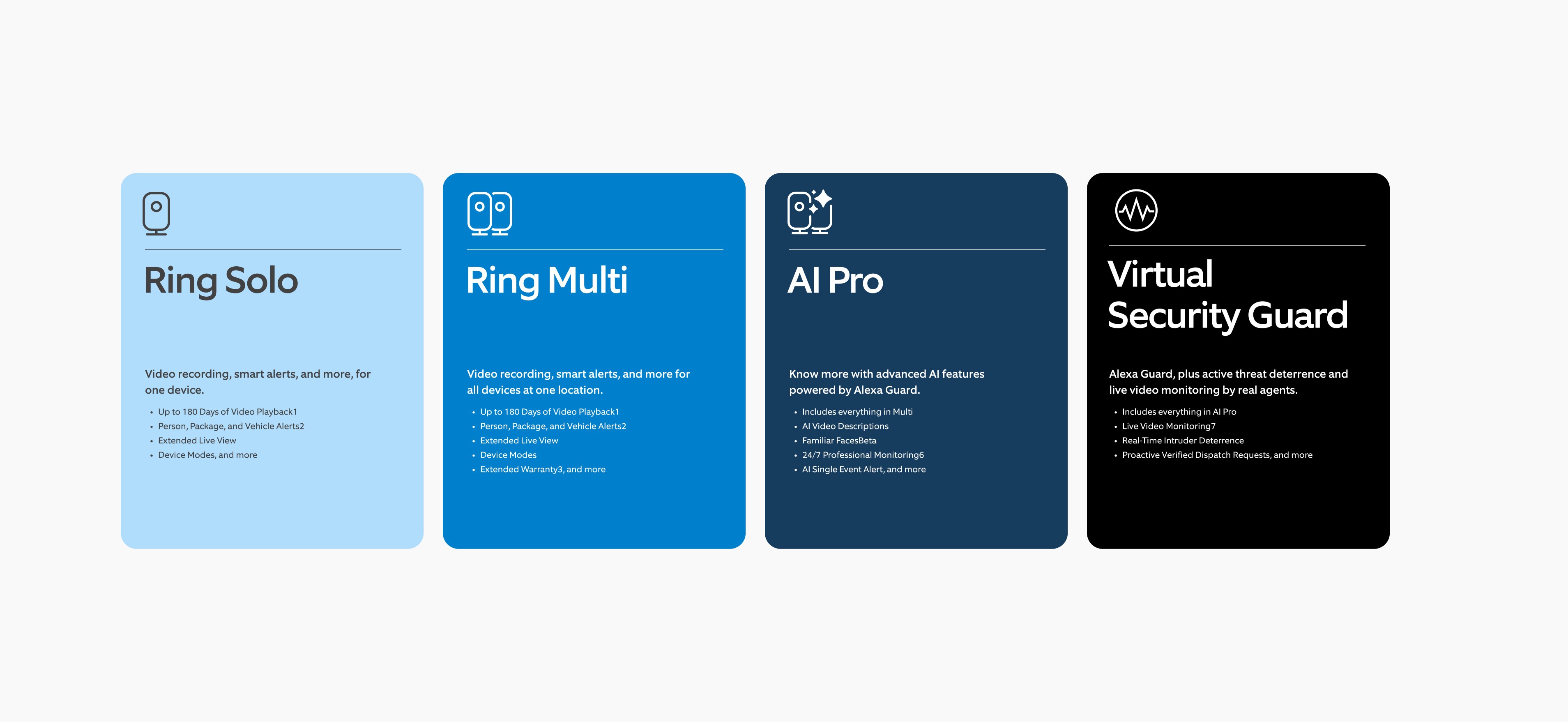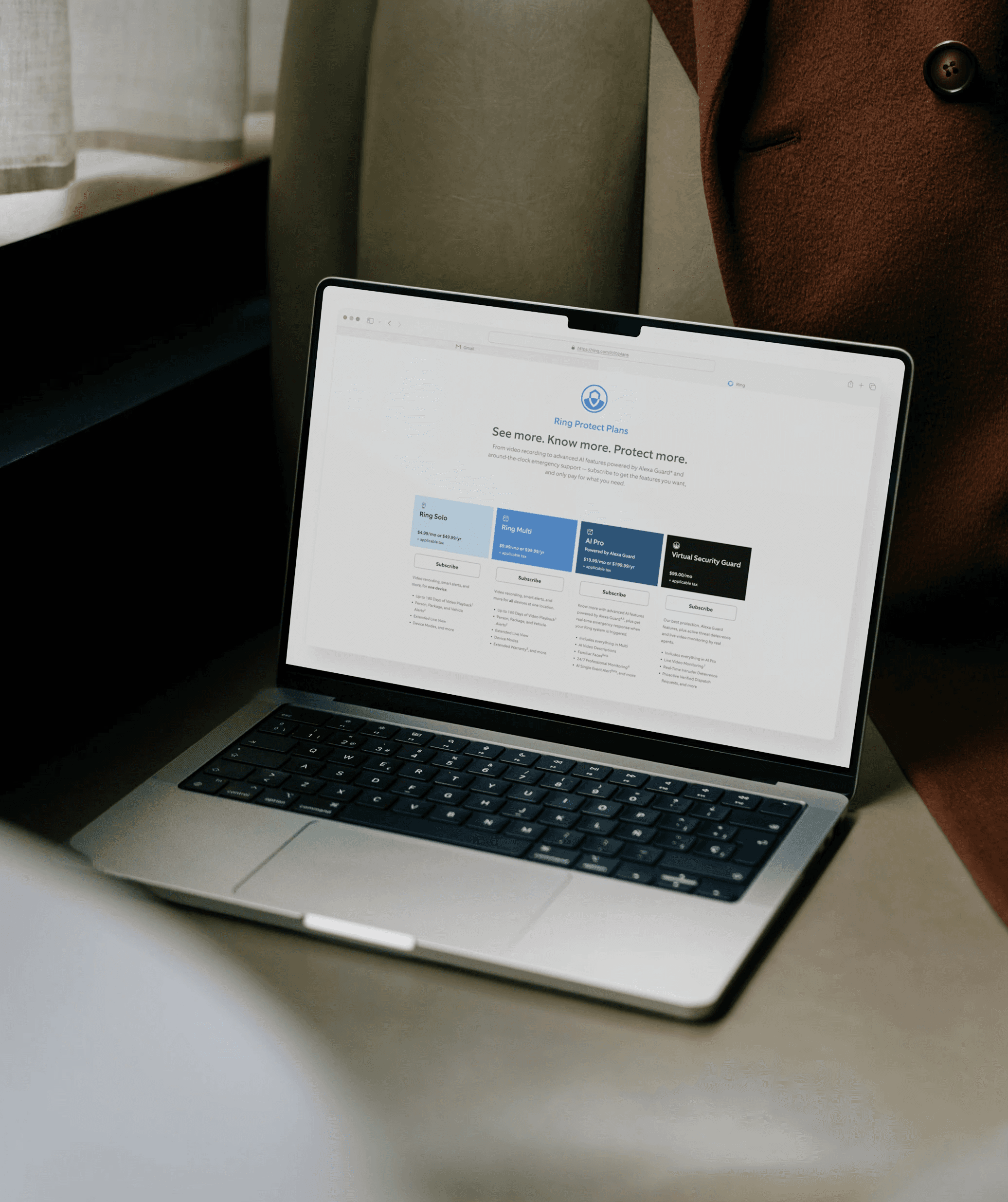 Brand and product marketing systems designed to drive subscription adoption, retention, and long-term value. As Ring expanded its Home and Business plans, growing Al features and bundled offerings increased complexity. I led the design of plan architecture, comparison logic, and feature storytelling - reframing subscriptions as evolving ecosystems rather than static pricing tiers.